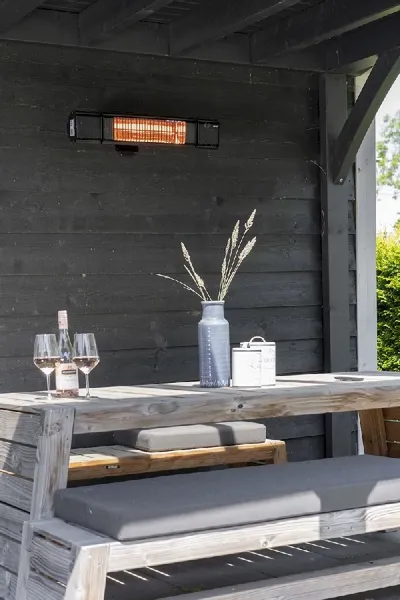 Het verwarmingselement van deze elektrische terrasheater verwarmt niet de lucht op je terras, maar de voorwerpen op je terras. Hierdoor wordt niet de omgeving, maar jouw lichaam lekker warm. Ander voordeel hiervan is dat de warmte van deze heater nauwelijks verwaaid. Dit maakt deze terrasverwarmer van Eurom zeer geschikt voor gebruik op een open terras. Bovendien heeft deze terrasverwarmer een IP-waarde van 65, wat inhoudt dat deze stof- en spuitwaterdicht is en altijd buiten kan blijven staan. Wat voor weer het ook is, met deze terrasverwarmer zit jij er altijd warmpjes bij op je terras.