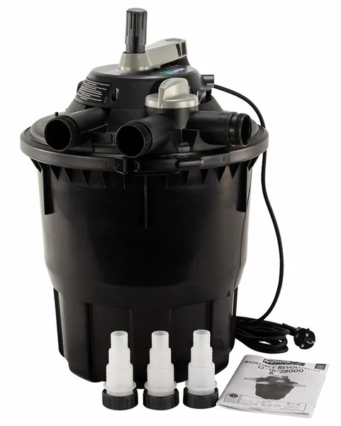 De Hozelock Bioforce 28000 is geschikt voor vijvers zonder visbezetting tot 28.000 liter. Wanneer jouw vijver een lage of hogere visbezetting heeft wordt de maximale vijverinhoud verlaagd tot respectievelijk 21.000 en 14.000 liter. In de Hozelock Bioforce 28000 zorgen filterschuim, bioballen en UVC straling (36 watt) voor een complete drievoudige filtratie. Het vijverwater dient door een vijverpomp (netto maximaal 8000 liter per uur) door de drukfilter heen geperst te worden.