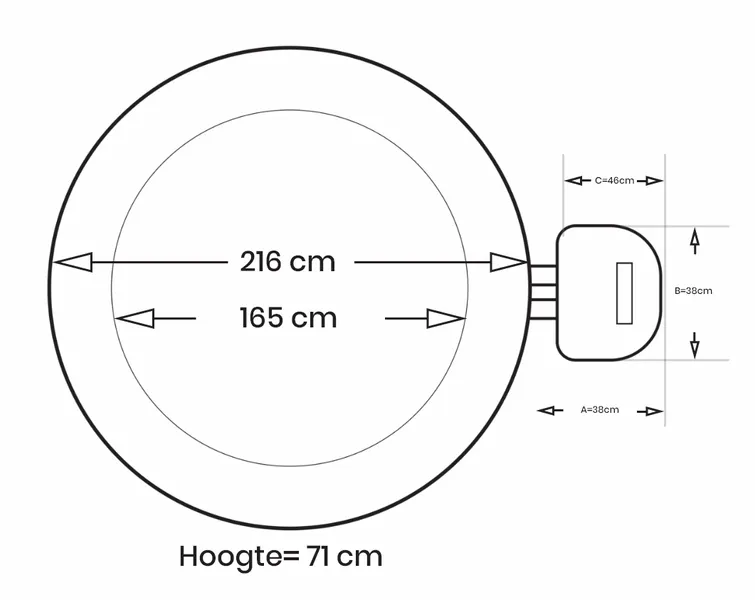 Let op: Om de Intex Pure Spa Greywood Deluxe volledig (inclusief motorblok van 38x46x38 cm) te kunnen plaatsen, adviseren wij een minimale (tuin)ruimte van 300 bij 220 cm. De kabel is 3,5 meter lang, dus zorg dat er binnen deze lengte een stroomvoorziening aanwezig is.