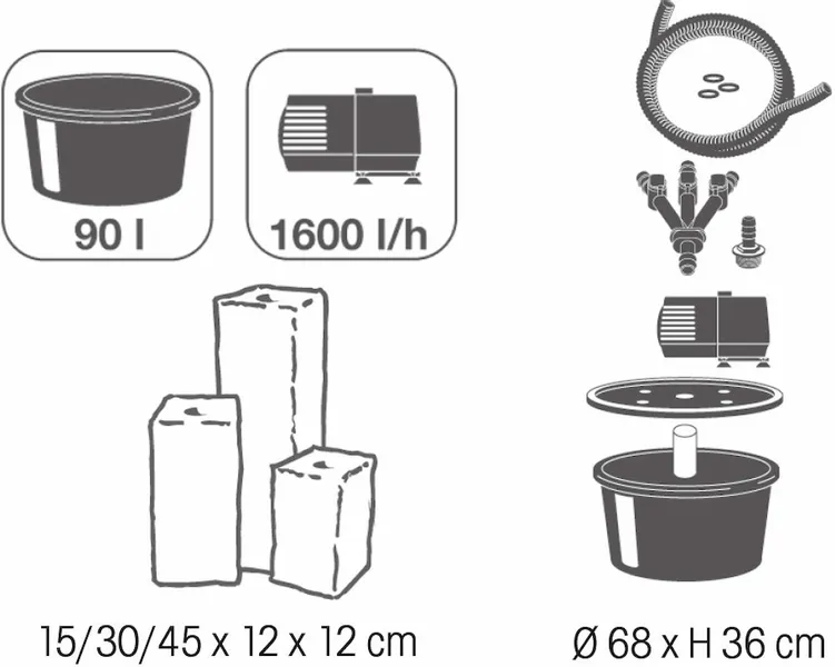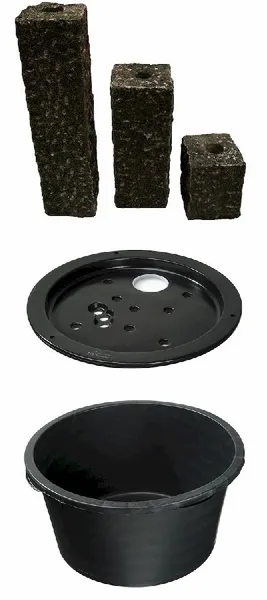 Alles wat je nodig hebt om de set te laten werken, wordt meegeleverd. Zo is in de set een pomp met een capaciteit van 1600 liter per uur opgenomen. Het ornament plaats je boven een waterbassin met een inhoud van 90 liter. Door rond het ornament stenen te plaatsen, maak je het waterbassin onzichtbaar en lijkt het alsof het water in de grond wegstroomt.