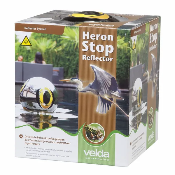 De Velda Heron Stop Reflector beschermt je vijverbewoners tegen reigers dankzij een dubbel effect. Door de afgebeelde ogen van roofvogels én de spiegeling van de zilverkleurige drijfbal worden reigers afgeschrikt waardoor ze de vijver in het vervolg ook niet meer durven te benaderen. Tijdens raketlanceringen wordt hetzelfde principe gebruikt om vogels op een afstand te houden. Laat deze unieke Heron Stop Reflector in de vijver drijven om een directe vlucht reactie teweeg te brengen. De drijvende bal met de ogen van een roofvogel zal voorkomen dat reigers de vijver nogmaals zullen bezoeken. Wanneer je vijver groot is kan je er altijd voor kiezen om meerdere ballen in de vijver te plaatsen, om zo de hele vijver te beschermen.